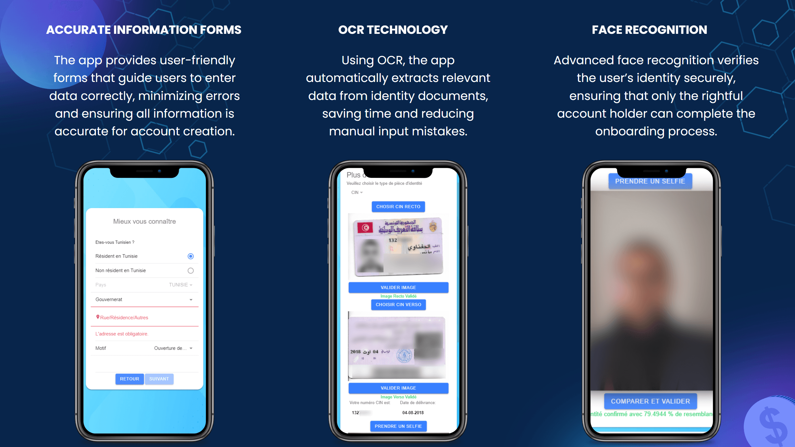 A secure mobile application that enables users to open bank accounts remotely by leveraging face recognition and OCR technology to verify identity documents with high accuracy.